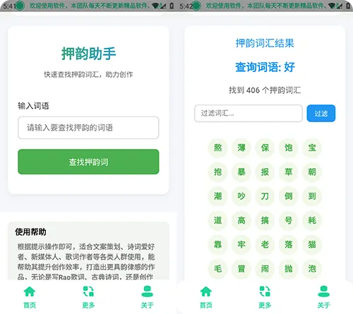 一款押韵助手App,创作灵感,妙笔生花! 提供押韵词语搜索、诗歌创作辅助等功能,帮助你创作诗歌、歌曲、歌词等,发创作灵感。 界面简洁,作便捷,是你的创作好帮手!