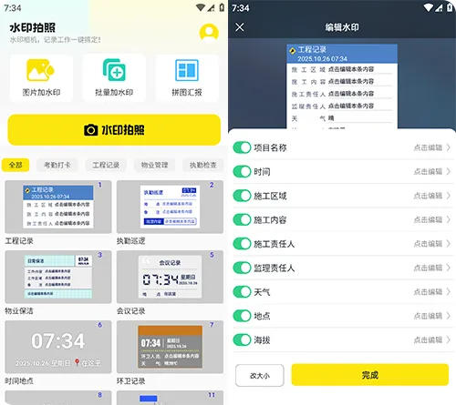水印相机免费打卡拍照是专为工作记录、考勤打卡设计的手机软件,主打多场景水印模板、精准信息记录与行业适配功能,无需额外工具即可添加真实可信的水印信息,保障照片真实性,适配外勤考勤、工程记录、会议留痕等工作场景,是提升工作效率的实用工具。