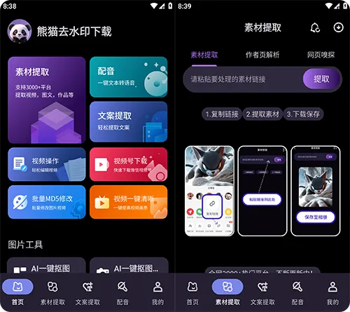 熊猫去水印是一款主打视频与图片水印去除的软件,支持多平台素材无水印提取,还提供视频剪辑、画质增强等辅助功能,无需切换多工具即可完成素材处理,适配自媒体创作者、日常用户等素材优化需求,是兼具便捷性与实用性的多媒体处理工具。
