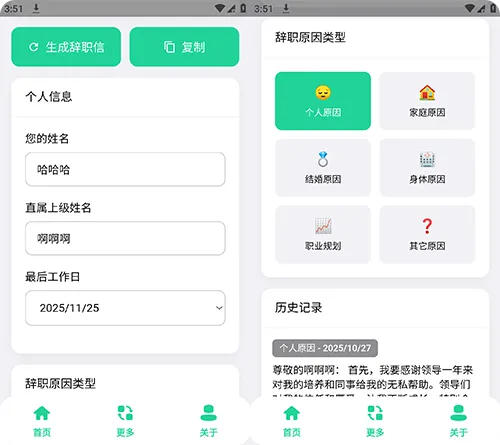 一款辞职信生器App,快速生,高效便捷! 提供辞职信模板、自定义编辑功能,帮助你快速生符合你需求的辞职信,省时省力。 界面简洁,作简单,是你的辞职信撰写好帮手!