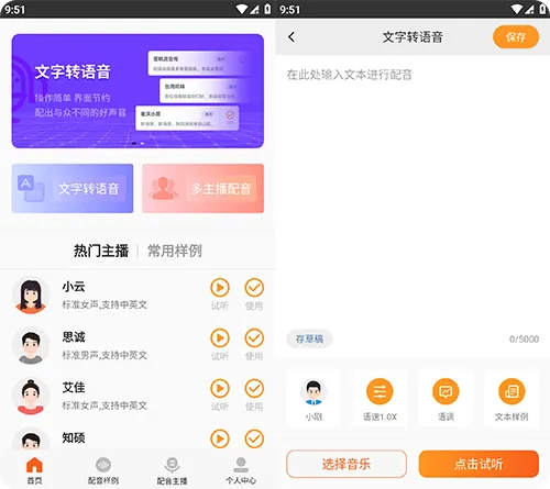 支持中英文随意切换,提供多种发音人选择,满足不同风格配音需求。可精准调节语速、语调与音量,搭配海量背景音乐,让合成语音更具层次感。内置文字编辑功能,输入文本即可智能合成语音,无需专业录音设备,新手也能快速产出优质音频。文章来源:知源网www.zhiyuanpro.com知源网-https://www.zhiyuanpro.com/4804/.html