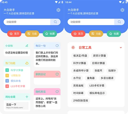 大白工具箱是安卓综合工具APP,多功能集成、免费无广且低耗流畅,内置近百种实用工具,覆盖图片处理、文件转换、生活查询、办公辅助等场景,无需注册登录即可使用,是兼顾办公、学习与日常需求的贴身工具。