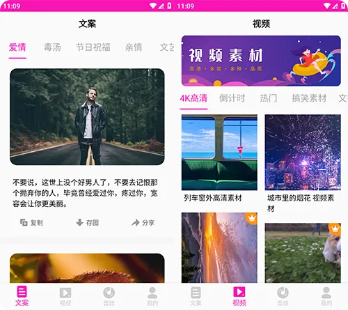 素材库是一款专为内容创作者打造的独立安卓素材提供软件,聚焦文案、视频、音效三大类素材供给,全程免费无广、免注册登录即可使用。素材资源实时更新且分类清晰,适配短视频剪辑、文案创作、自媒体运营等多场景需求,是提升创作效率、丰富内容质感的实用工具。