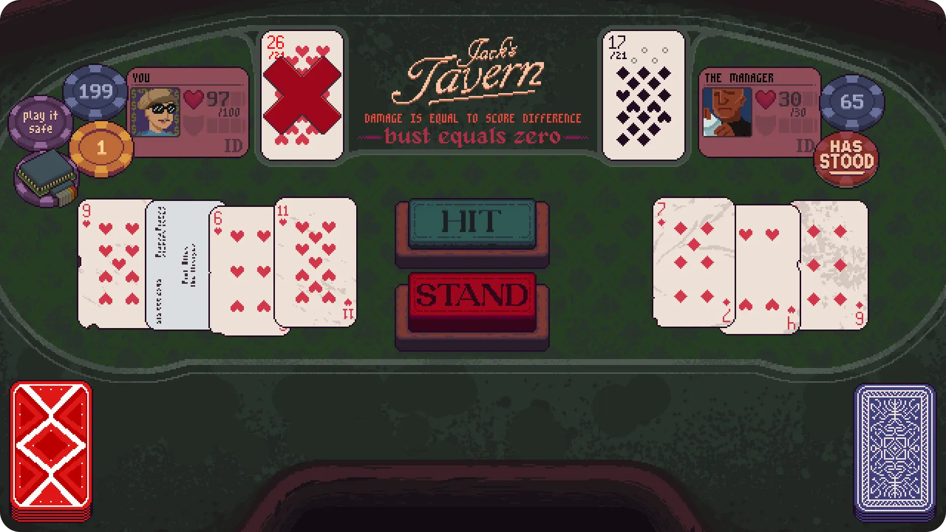 再来一张是一款融合21点玩法与肉鸽元素的策略卡牌游戏,玩家将在复古风情的酒馆中穿梭,与形形色色的角色展开扑克对决,以“接近21点但不爆牌”为核心机制,结合策略叫牌、随机事件与多样卡牌类型,每一局都能带来独特的博弈体验,核心乐趣在于牌组构建与战术博弈。